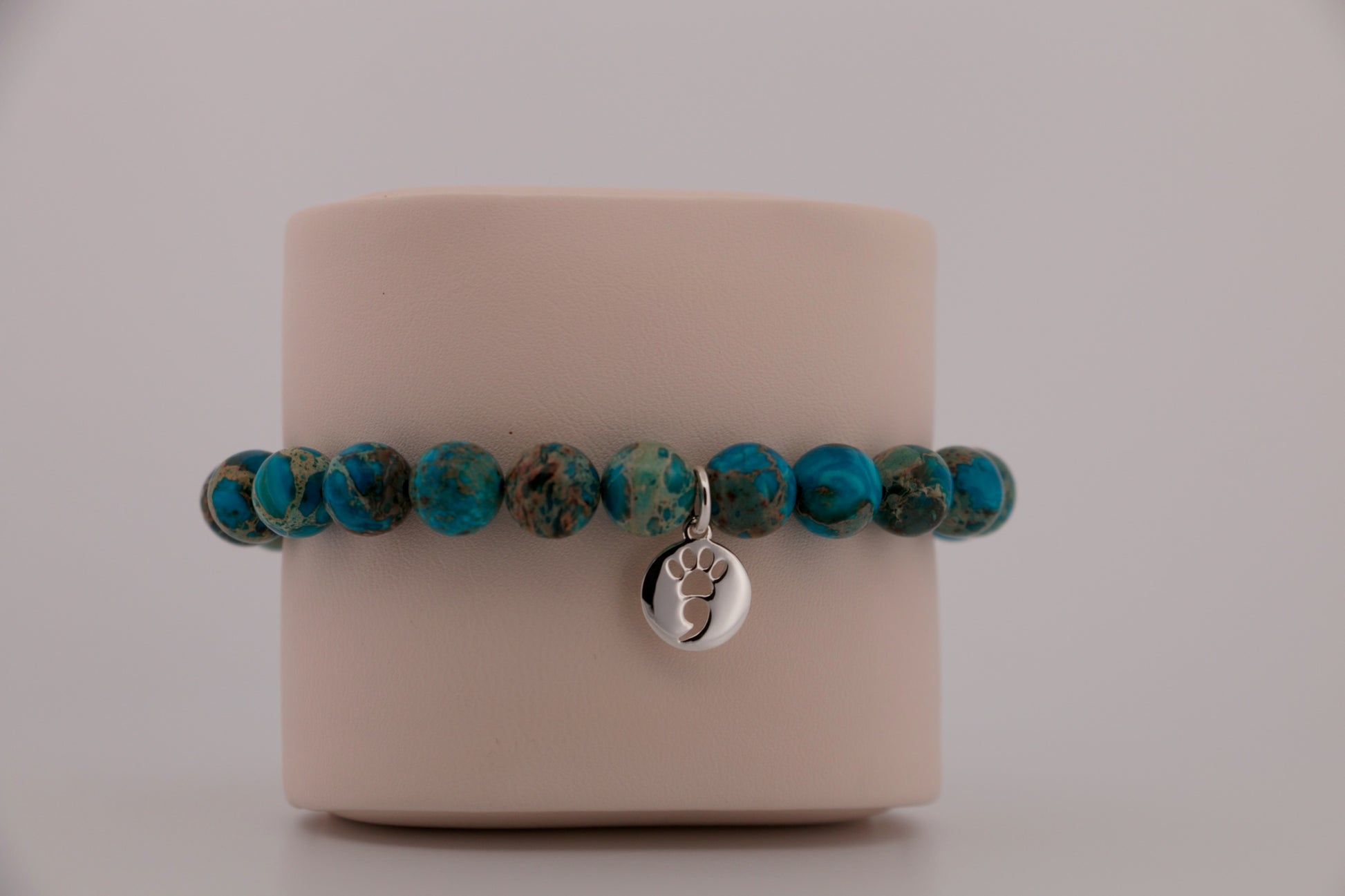 A calming bracelet crafted from natural apatite blue sediment imperial jasper beads, each one unique in its mix of deep blues and earthy tones. Every piece is strung on a stretch cord for a comfortable fit and finished with a sterling silver pawmicolon charm, a symbol of mental health awareness and the healing bond shared between people and their pets.