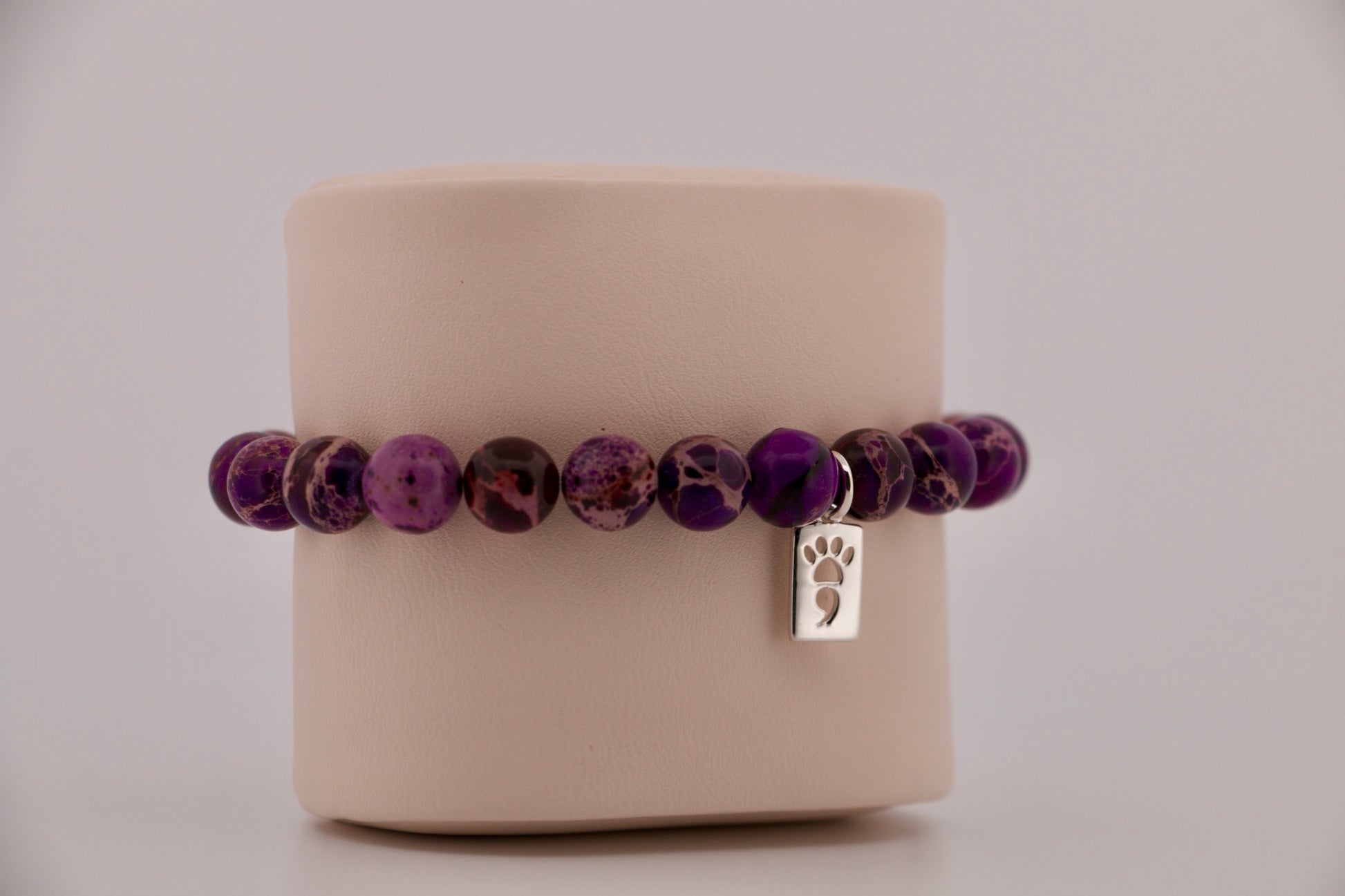 A vibrant bracelet crafted from natural grape purple sea sediment imperial jasper beads, each blending rich purples with soft earthy tones that make every piece unique. It’s strung on a stretch cord for a comfortable fit and finished with a sterling silver pawmicolon charm, a symbol of mental health awareness and the healing bond shared between people and their pets.