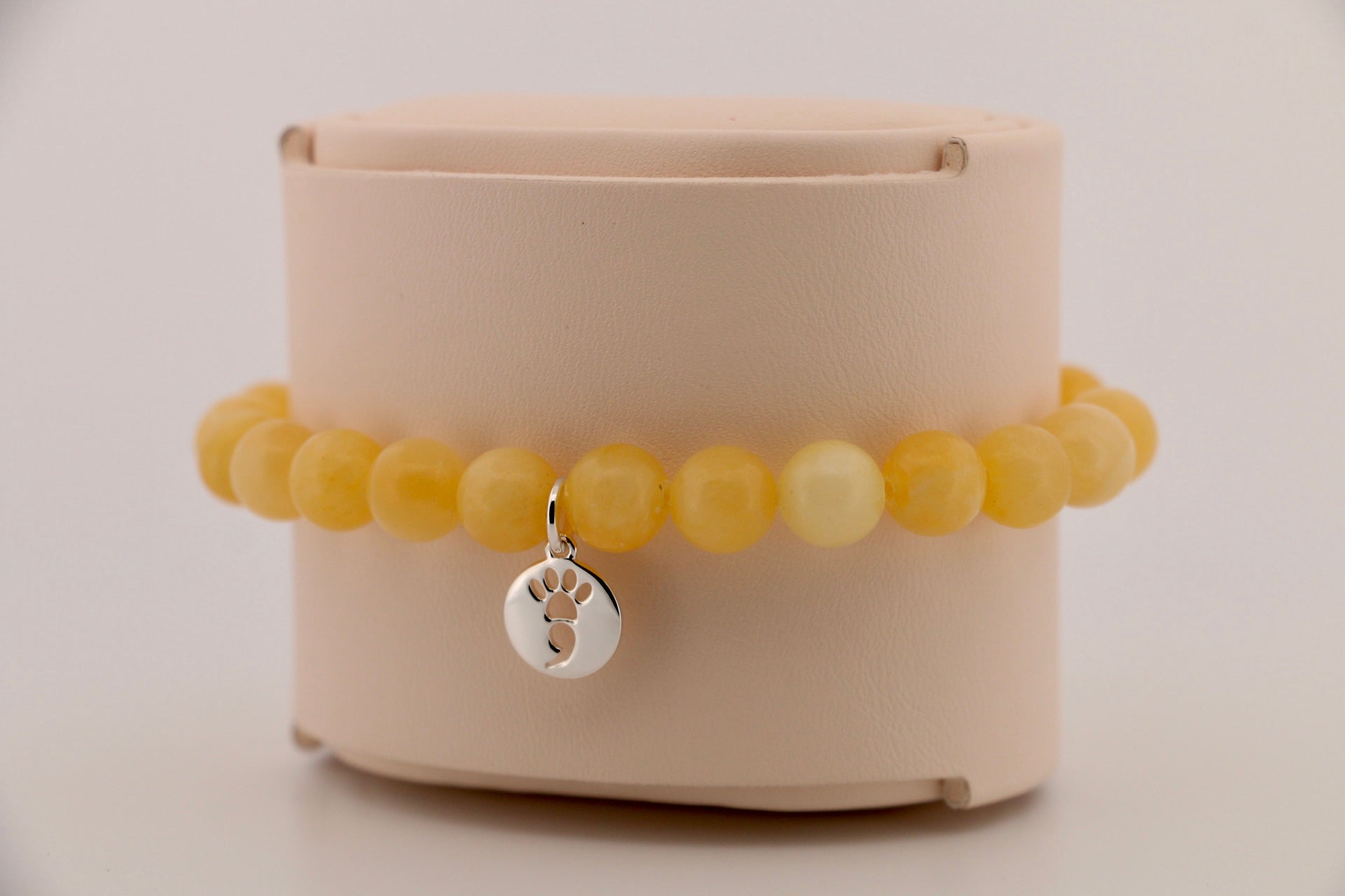 A soft, radiant bracelet crafted from natural honey stone beads, known for their warm, golden glow. Each piece is strung on a stretch cord for a comfortable fit and finished with a sterling silver rectangular cut-out pawmicolon charm, a symbol of mental health awareness and the healing bond shared between people and their pets.