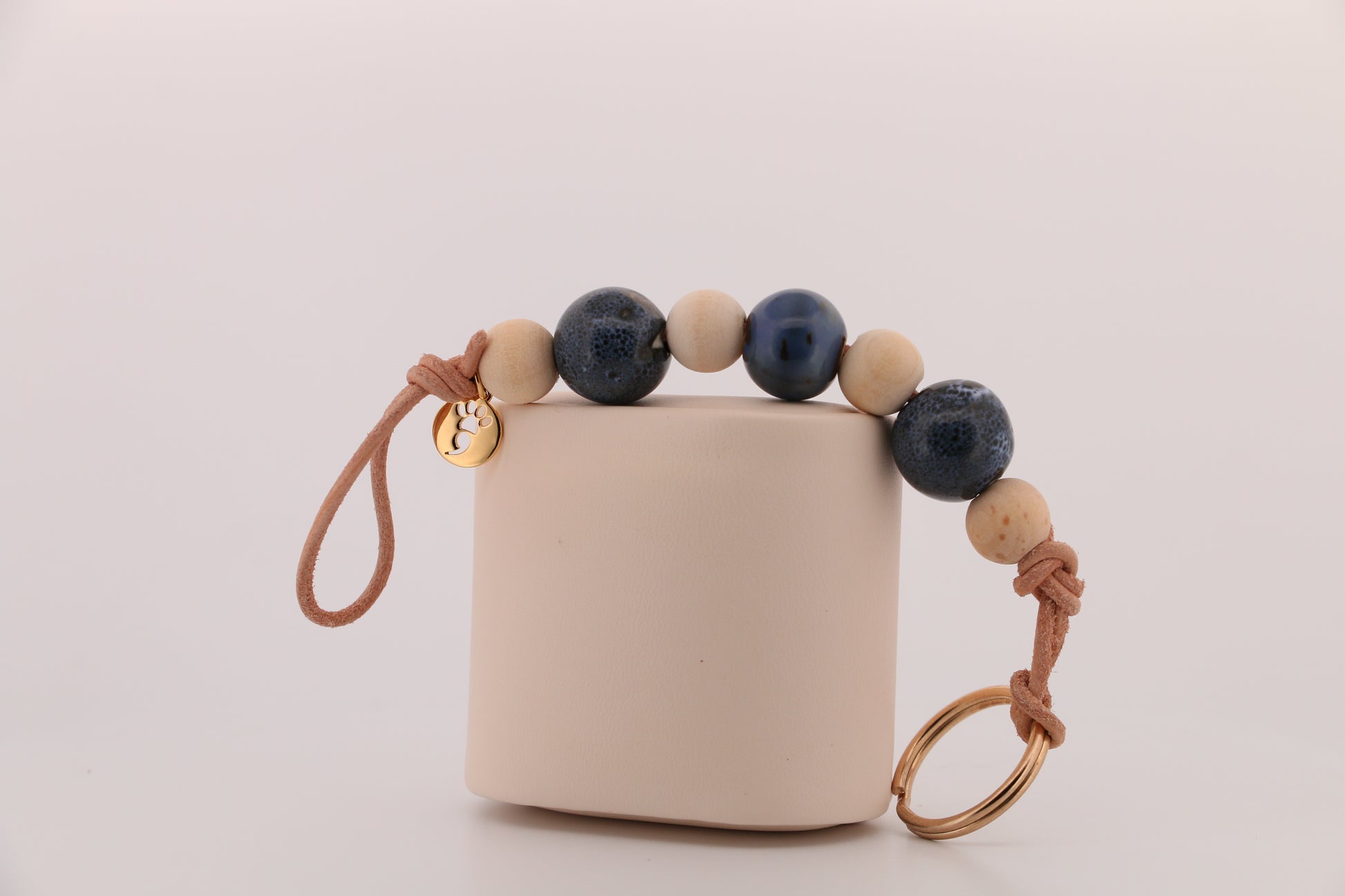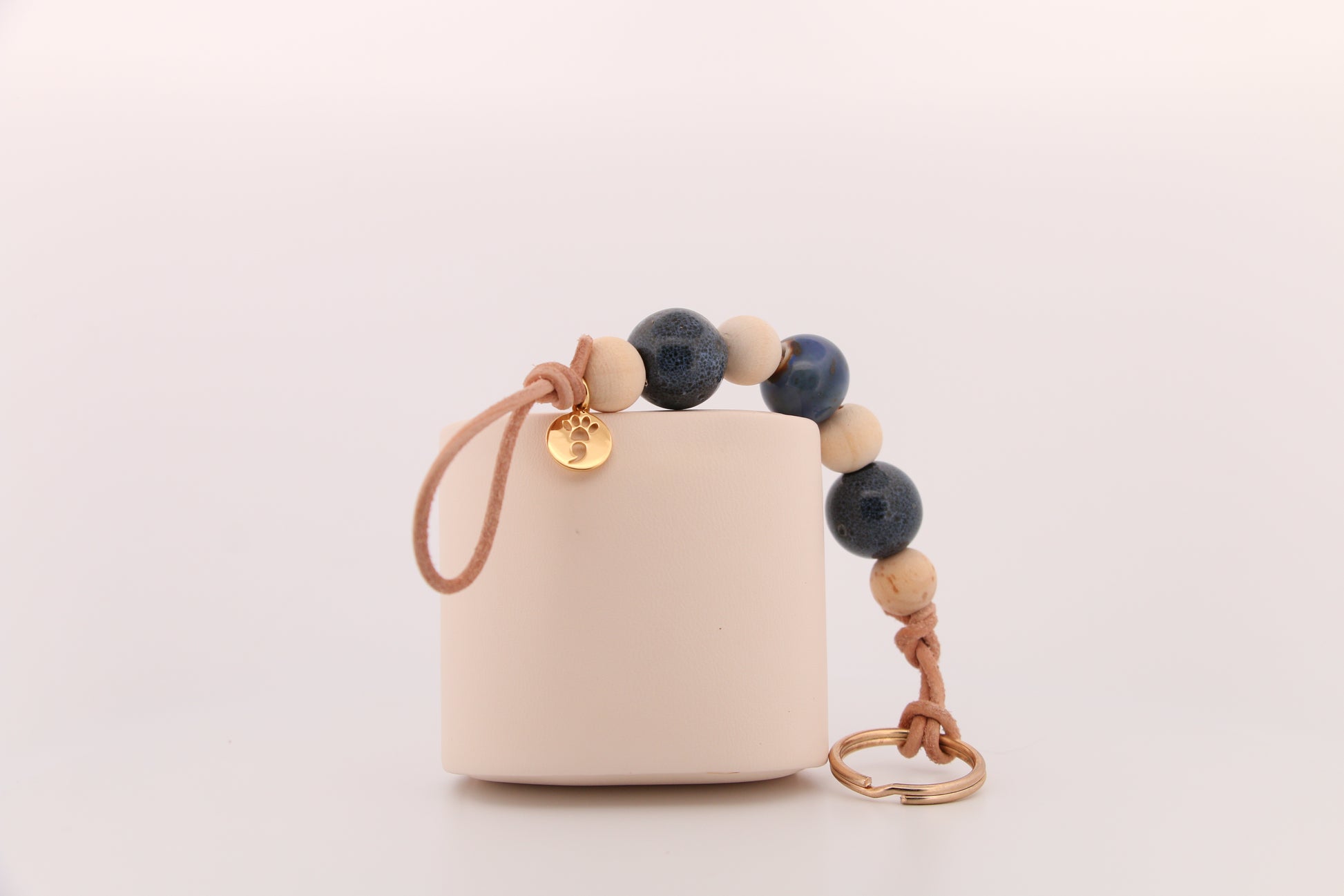 This keychain is made with soft natural leather and finished with deep blue beads and smooth wooden beads for a calm, balanced look. It is light, easy to carry, and includes our Pawmicolon charm for a familiar touch from The Paw’s Post. The wooden beads can also hold a small drop of essential oil if you ever want a hint of scent. A simple everyday keychain that feels good in your hand and adds a bit of style to how you carry your keys.