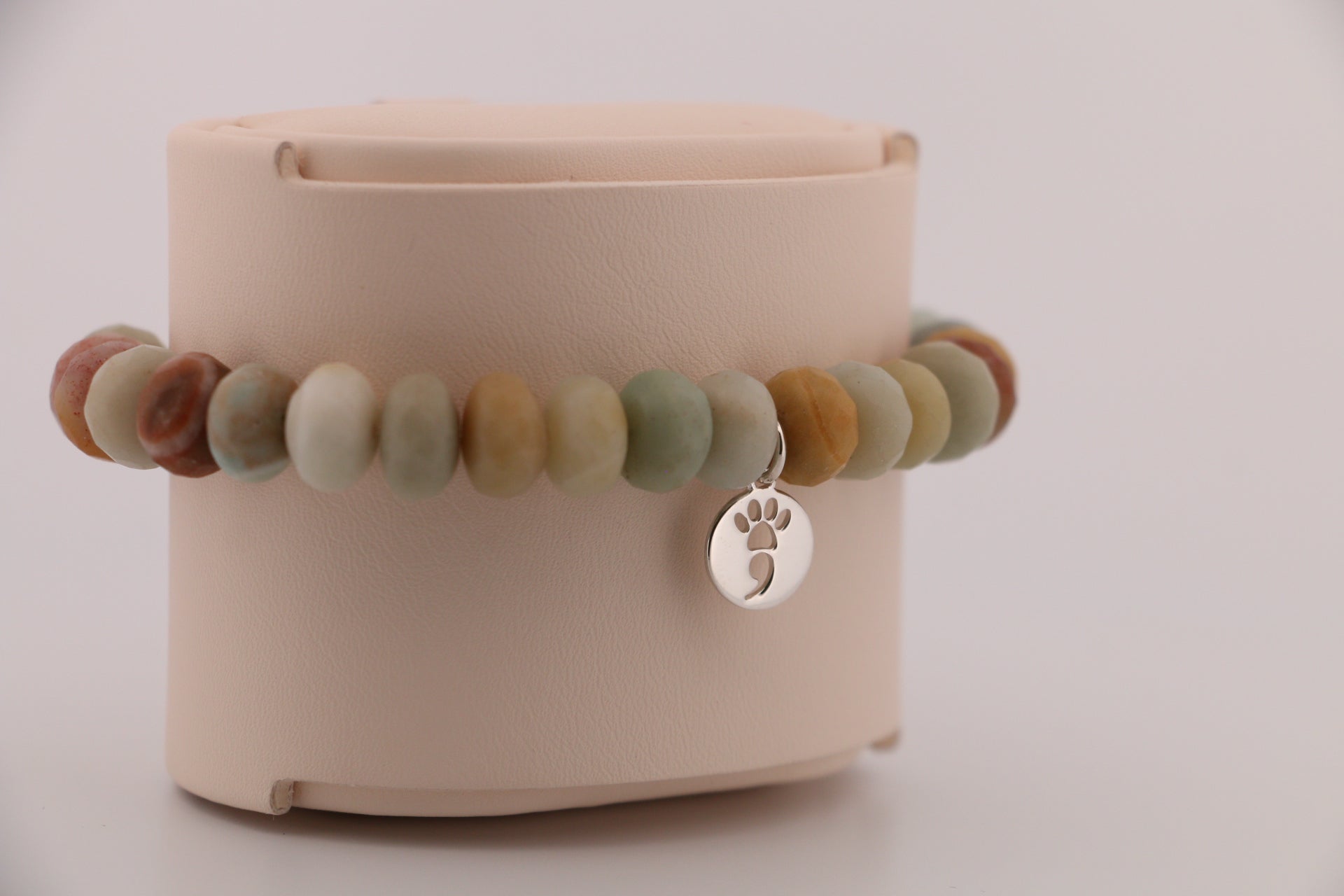 This bracelet features 8mm smooth natural flower amazonite rondelle beads, carefully selected for their soft blue-green tones and natural character. Each stone is substantial in size and weight, creating a piece that feels solid and well-made on the wrist. Finished with a 10mm pendant, the design is clean, balanced, and crafted with quality materials meant to be worn and appreciated daily.