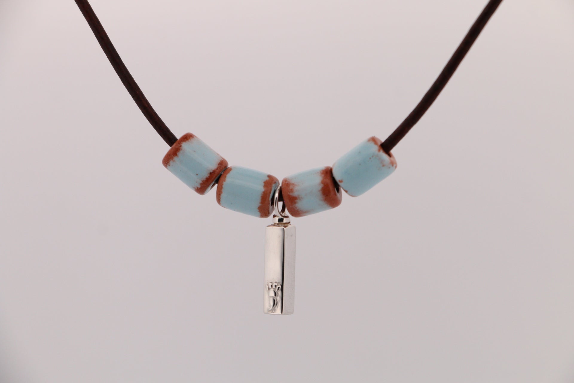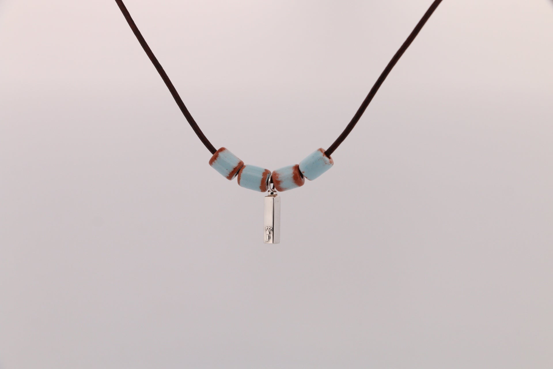 The Guardian Trail Urn Necklace features genuine dark brown leather accented with turquoise and brown barrel seed beads, finished with a .925 sterling silver urn pendant. Measuring 20" in length, it is secured with a charcoal grey recycled sea glass bead and leather loop clasp. Each piece is handcrafted and one of a kind.