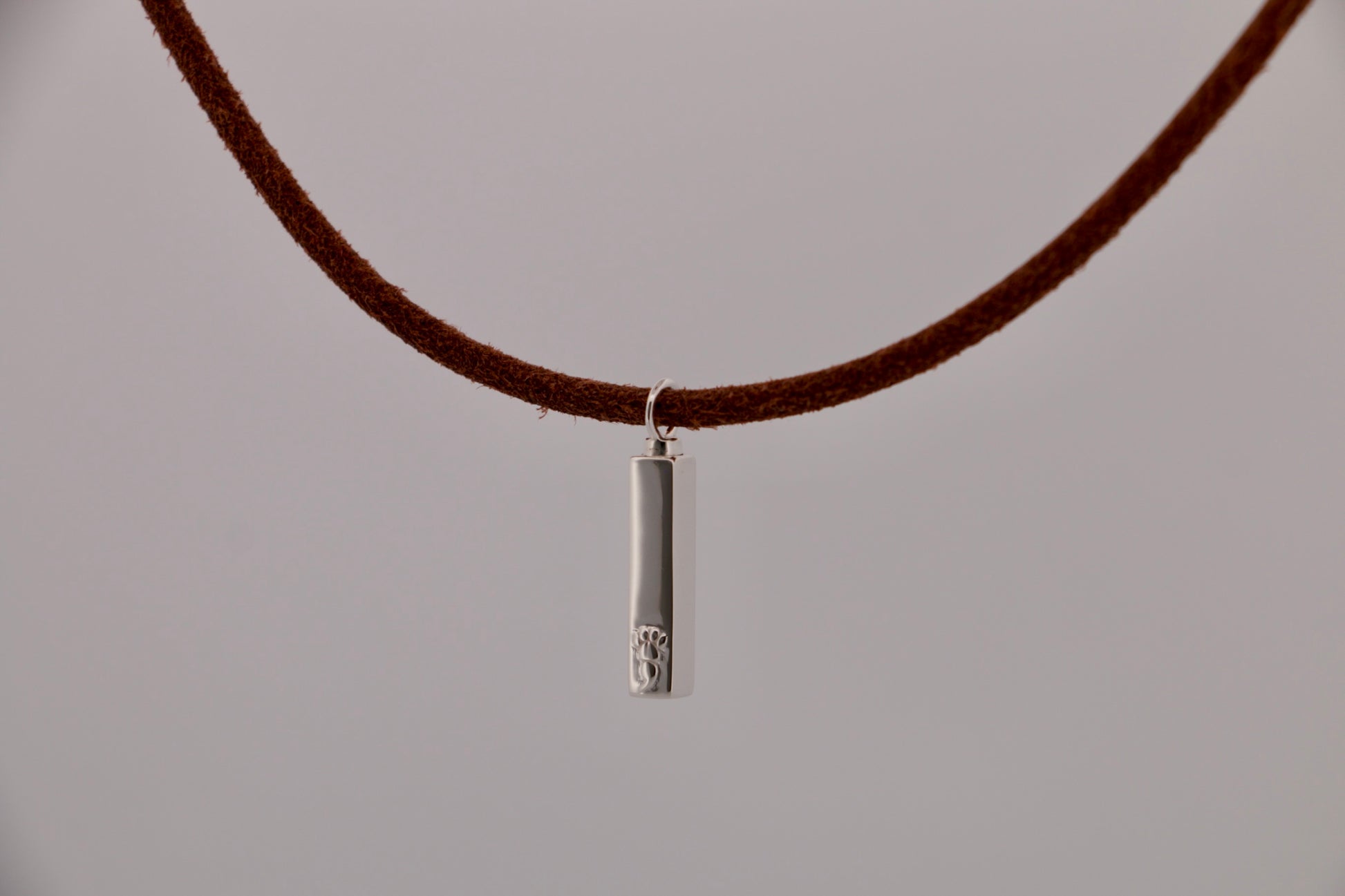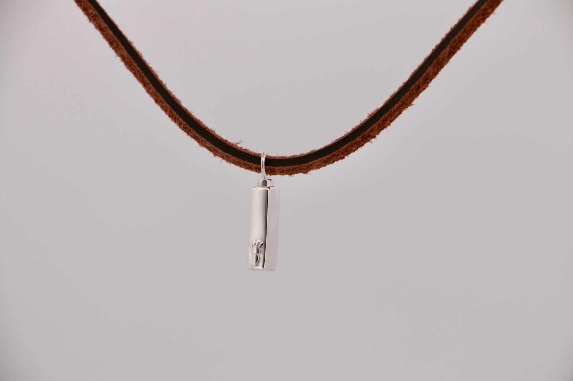 Handcrafted from natural brown half-round leather and sterling silver, this necklace is made to feel strong and grounded. The urn pendant is designed to hold a small amount of ashes or fur, offering a simple and meaningful way to keep your pup close after your loss. The leather is 3mm thick with a simple clasp that sits comfortably against the skin. It’s a piece meant to be with you every day and a quiet reminder of loyalty, love, and the bond that never really fades.